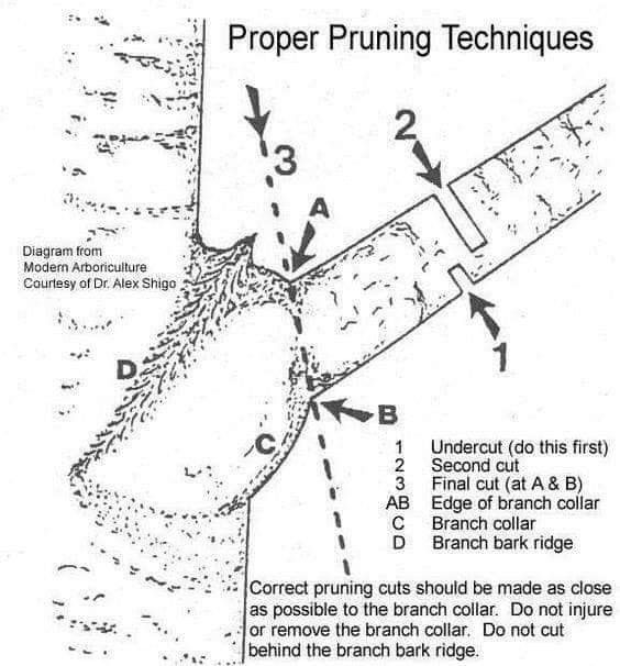 - 굵은 가지의 전정 : 밑동으로부터 10~15cm 정도 되는 곳에 아래쪽으로부터 굵기 1/3 정도 되는 깊이까지 톱으로 상처를 만든 후 이 위치보다 높은 곳을 위로부터 자른 후 가지가 떨어져 나가면 밑동에 톱을 내어 가지의 남은 부분을 제거함