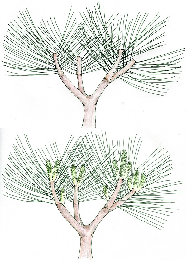 - 소나무류 순지르기 방법 : 4~5월경 5~10cm로 자란 새순을 3개 정도 남기고 중심순을 포함하여 손으로 제거