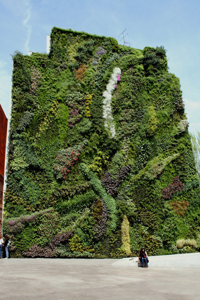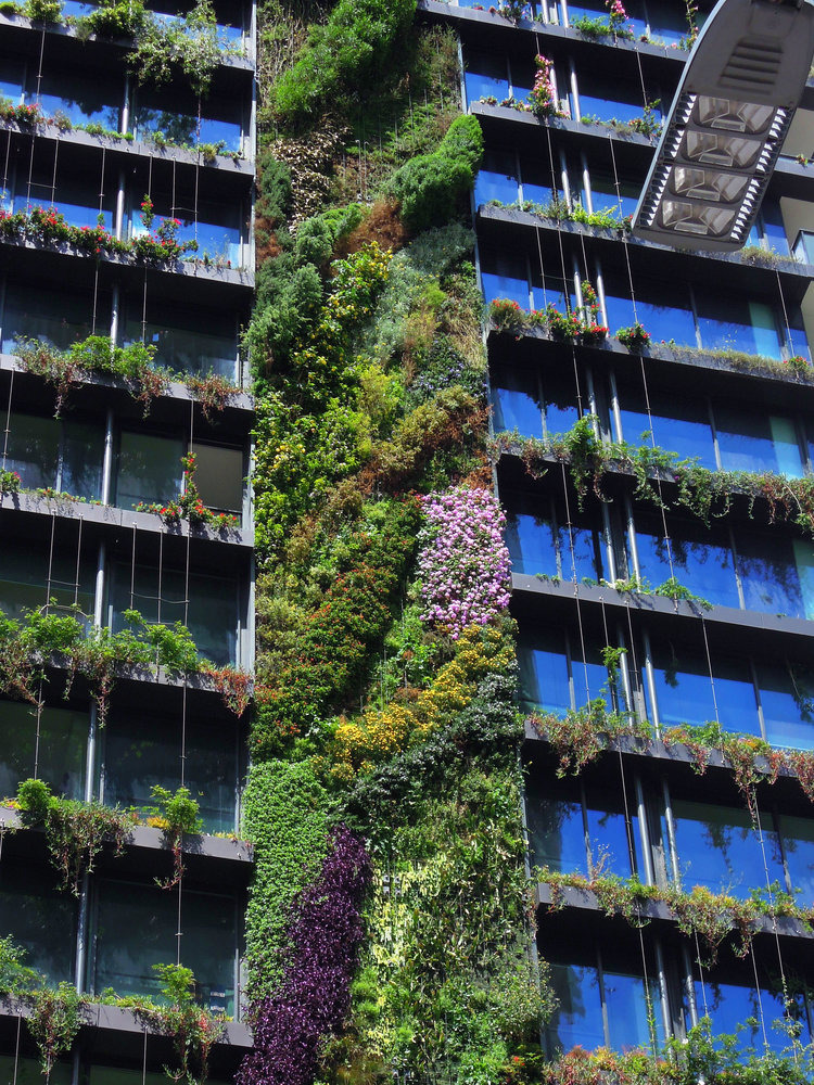 건물 옆의 벽면에 조성된 수직정원은 약 460㎡ 면적에 15,000개 이상의 식물이 식재되어 계절과 시간의 변화에 따라 다양한 모습을 연출한다.